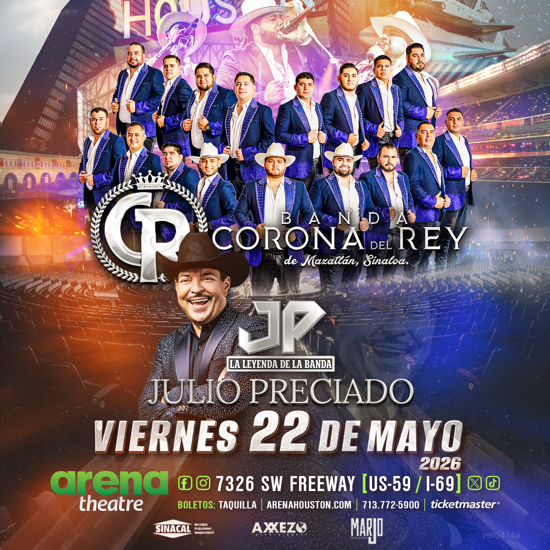 ¡Houston vivirá una noche histórica de banda sinaloense! Por primera vez en el Arena Theatre, Banda Corona del Rey y Julio Preciado llega con toda su fuerza, sus grandes éxitos y el inconfundible sonido del regional mexicano para hacerte cantar, bailar y celebrar en una fiesta inolvidable. No te pierdas este esperado debut el viernes 22 de mayo de 2026. ¡Compra tus boletos ahora antes de que se agoten! Presentan Sinacal, Axxezo y Marjo. Puertas abren a las 7PM.
