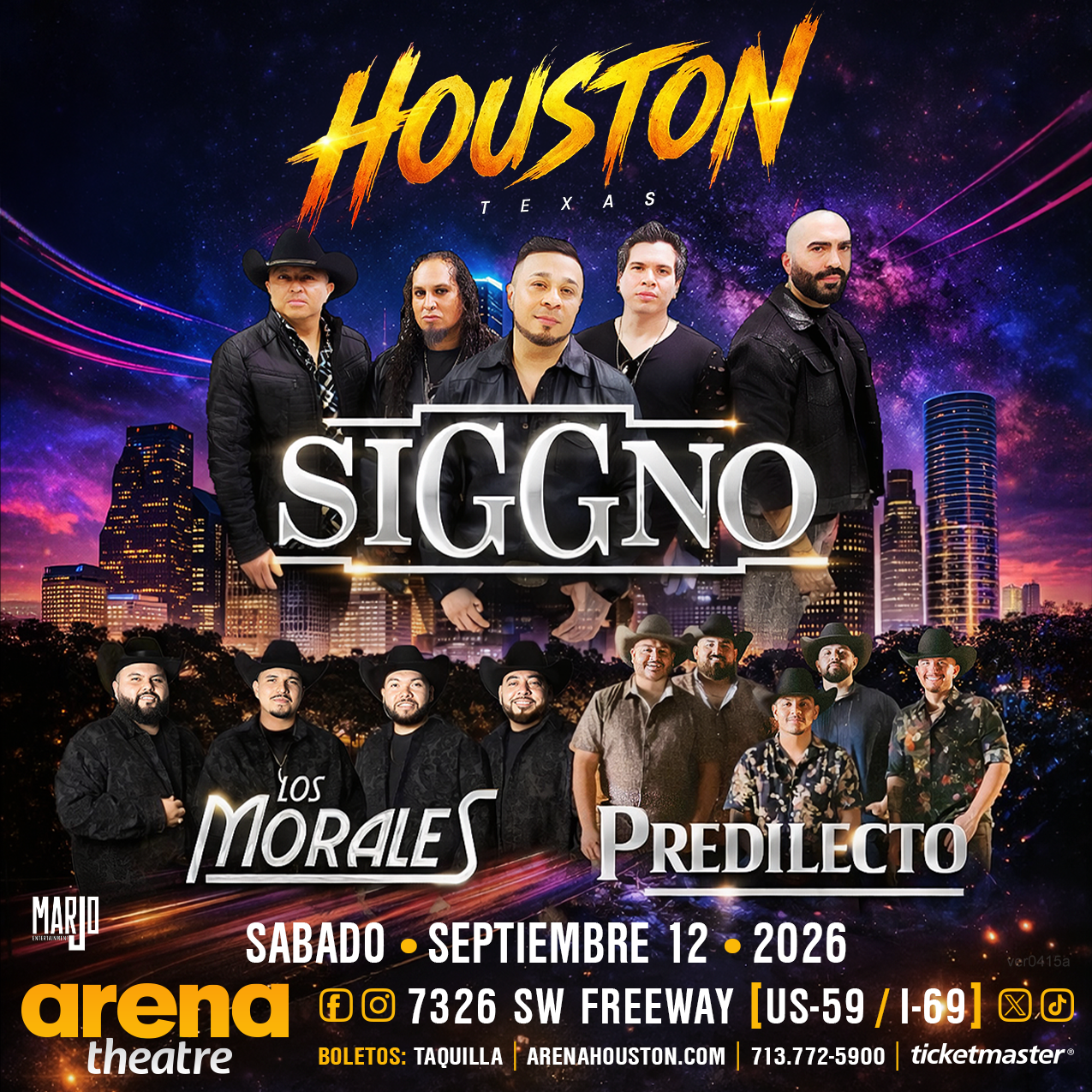 ¡Houston se prepara para el gran regreso de Siggno! La reconocida agrupación texana vuelve al Arena Theatre junto a Los Morales y Predilecto para una noche llena de energía y grandes éxitos. No te pierdas este esperado concierto el sábado 12 de septiembre de 2026. Presenta Marjo. Puertas abren 7 pm.