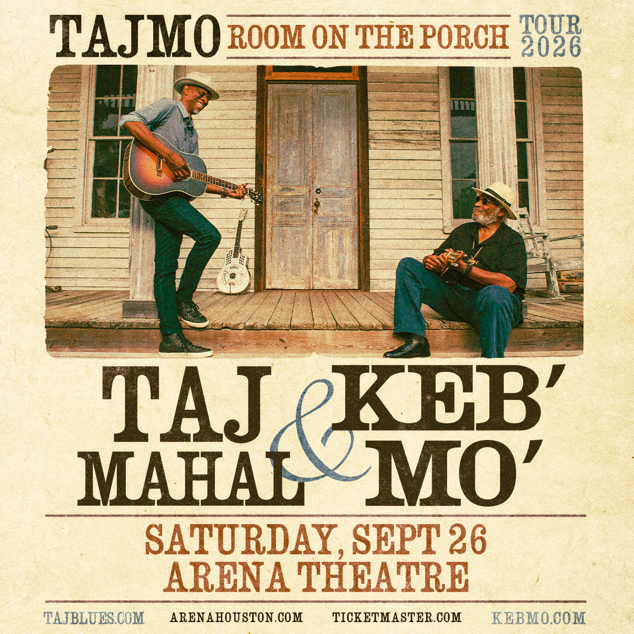 Houston, TX — TajMo, the collaboration between Taj Mahal and Keb’ Mo’, will perform live at the Arena Theatre in Houston on Saturday, September 26, 2026, as part of their Room On The Porch Tour 2026.