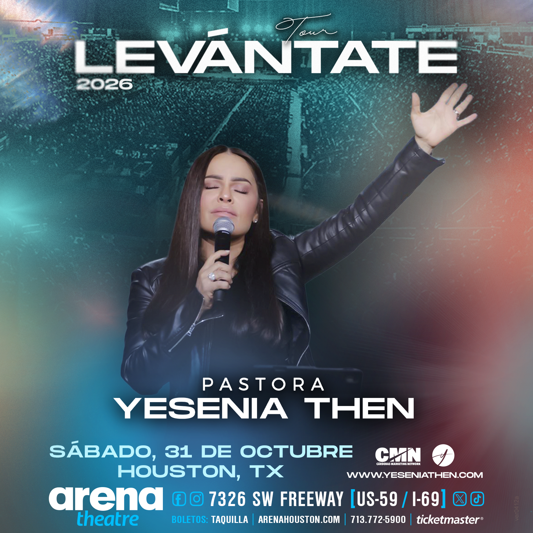 ¡Houston se prepara para un encuentro que marcará tu vida! La reconocida Pastora Yesenia Then llega el sábado 31 de octubre de 2026 con su impactante Tour “Levántate 2026”, una noche de activación, rompimiento y transformación espiritual. Prepárate para despertar lo que estaba dormido, romper ciclos que te detenían y recibir dirección divina para tu próxima temporada. ¡No te lo pierdas! Presentado por CMN. Puertas abren a las 7PM